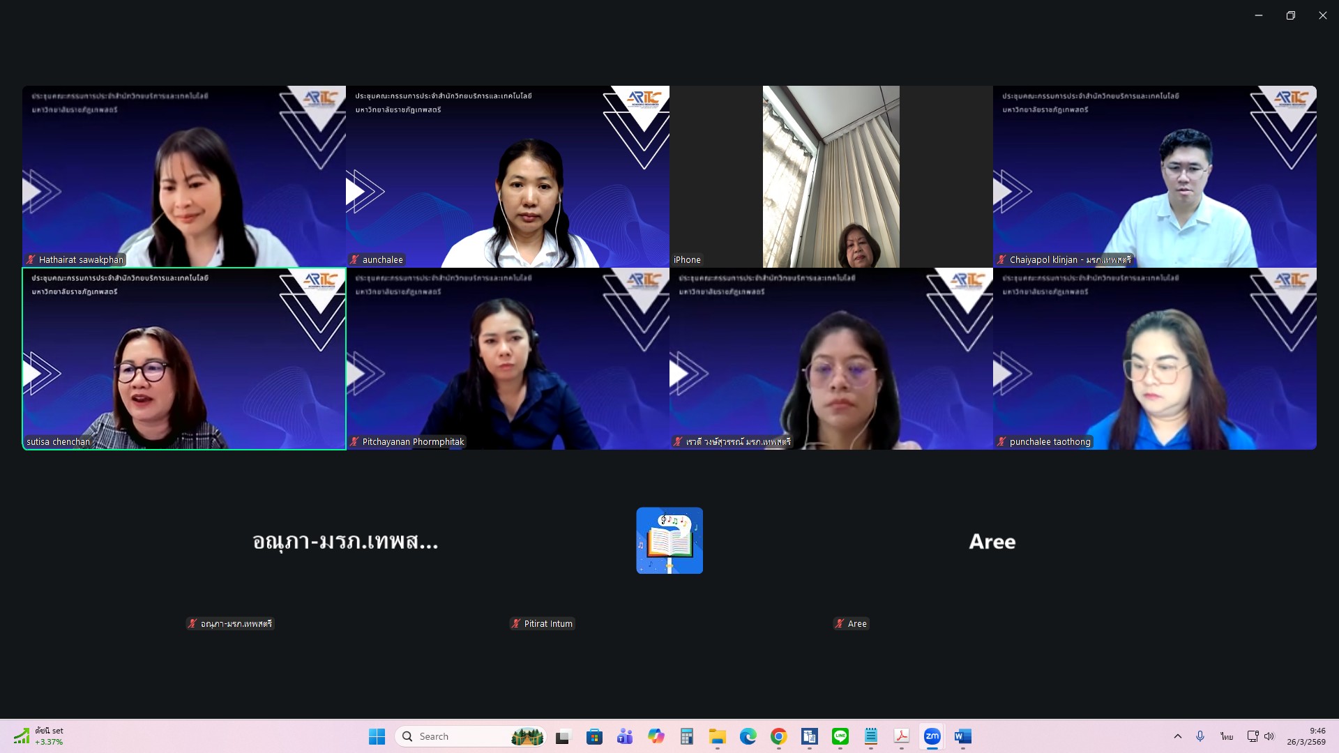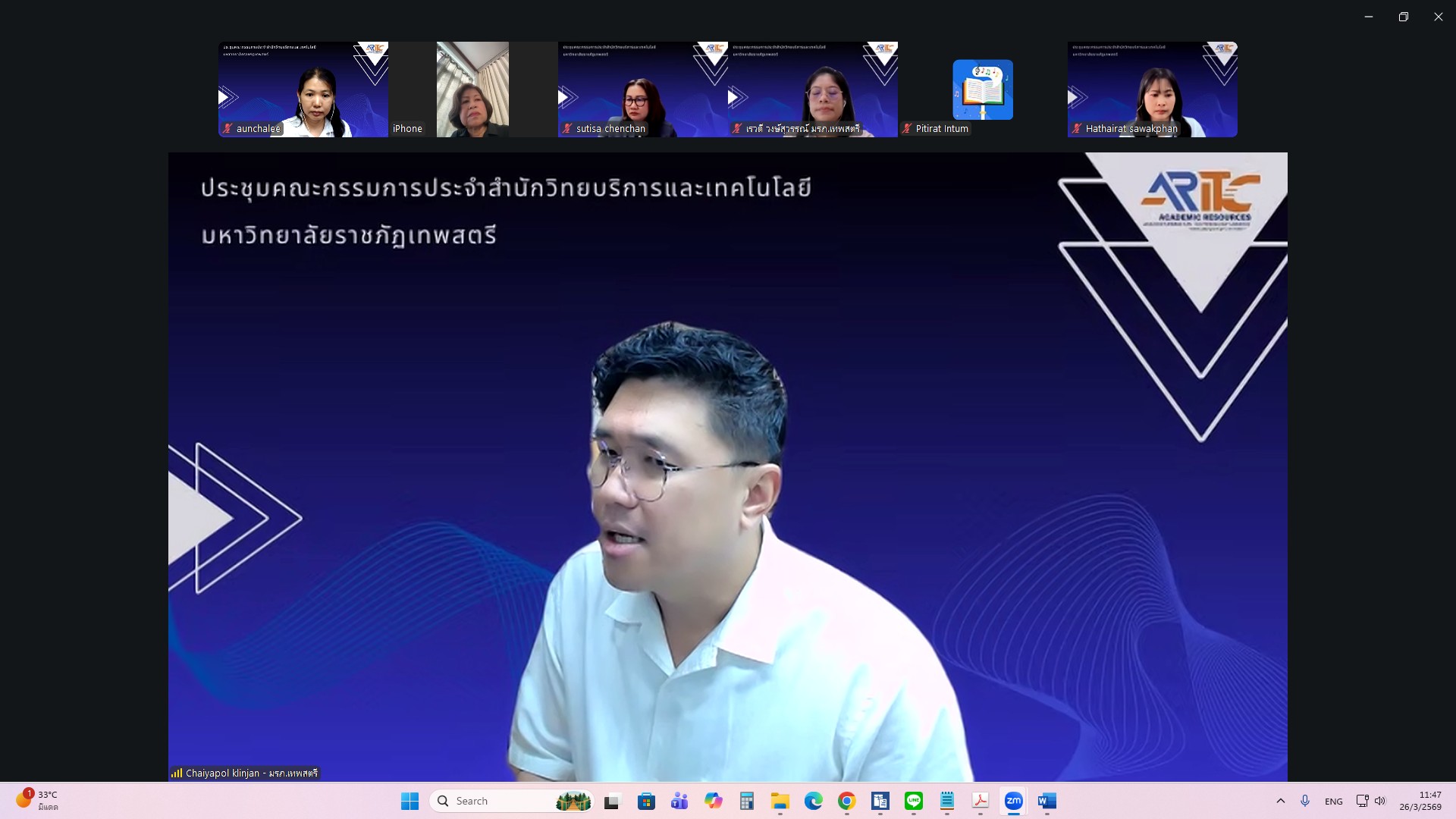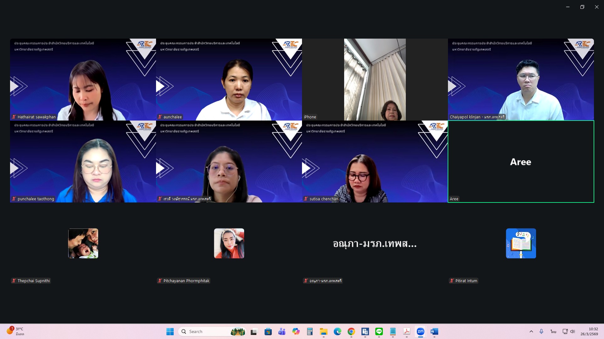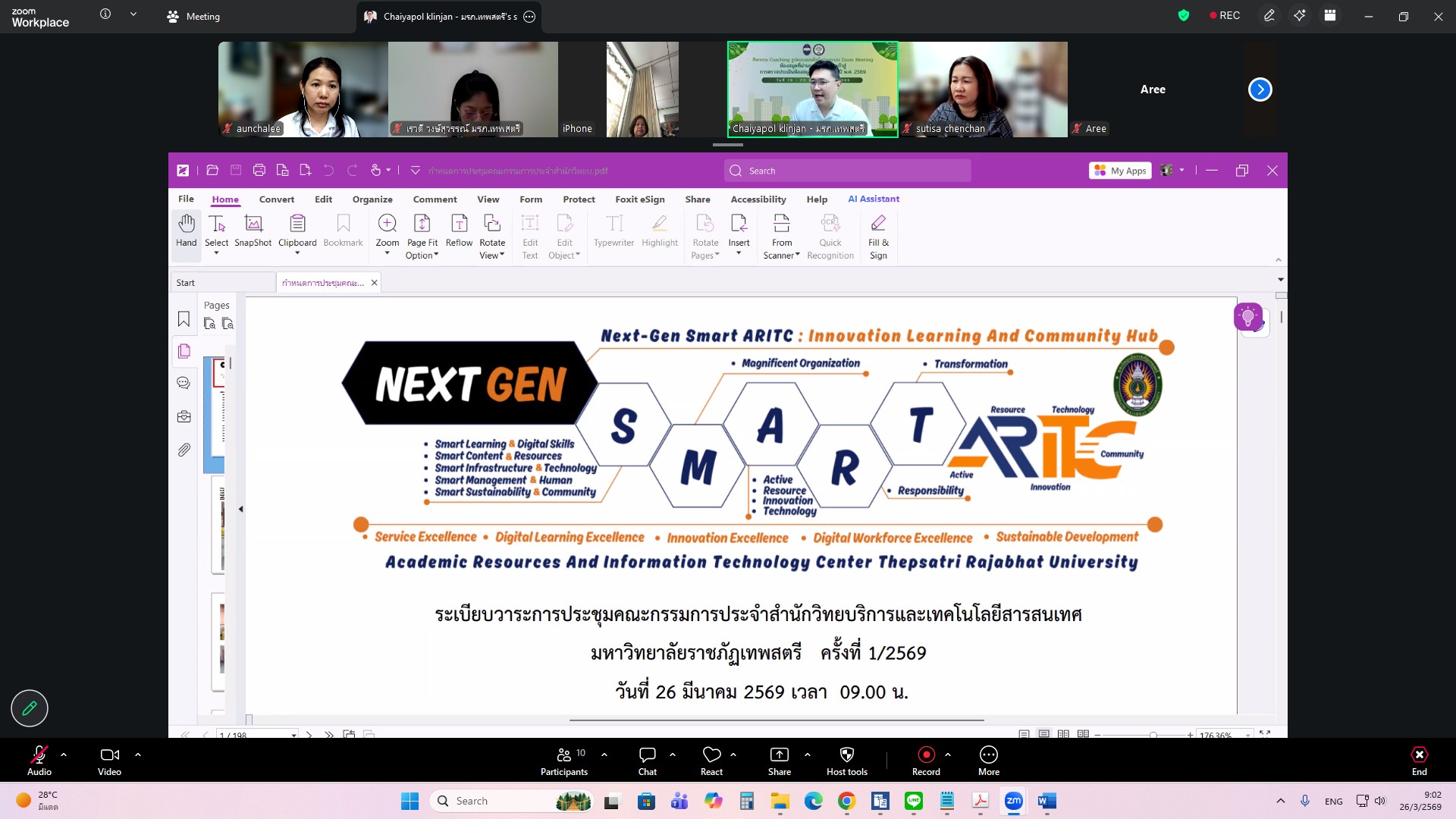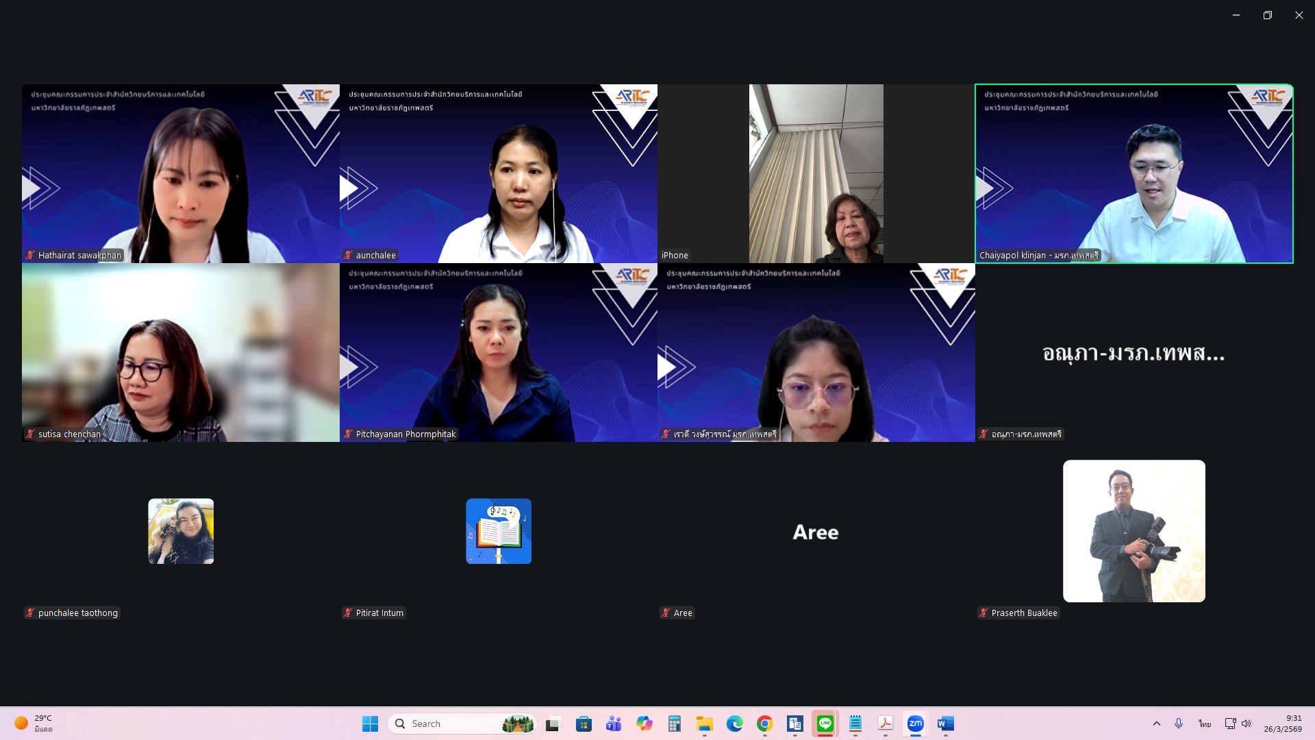 ผศ.ไชยพล กลิ่นจันทร์ ผู้อำนวยการสำนักวิทยบริการและเทคโนโลยีสารสนเทศ มหาวิทยาลัยราชภัฏเทพสตรี ให้เกียรติเป็นประธานการประชุมคณะกรรมการประจำสำนักวิทยบริการและเทคโนโลยีสารสนเทศ ครั้งที่ 1/2569 ในรูปแบบการประชุมระบบ e-meeting ผ่านสื่ออิเล็กทรอนิกส์ zoom Meeting เมื่อวันที่ 26 มีนาคม 2569 เวลา 09.00 น. โดยมีวาระที่เสนอเพื่อทราบ ได้แก่ แผนยุทธศาสตร์สำนักวิทยบริการและเทคโนโลยีสารสนเทศ มหาวิทยาลัยราชภัฏเทพสตรี พ.ศ. 2568–2572 , สรุปผลการ Coaching นำเสนอผลการดำเนินงานสำนักงานสีเขียวและห้องสมุดสีเขียว