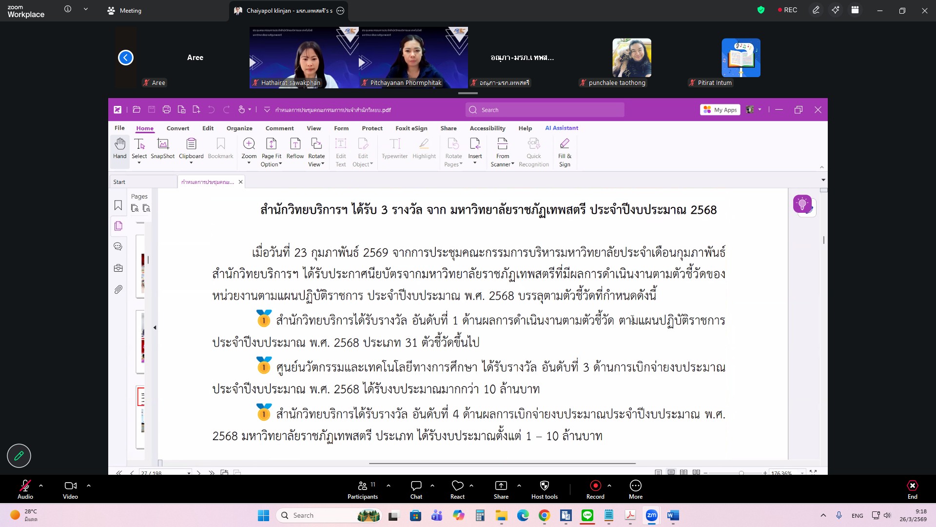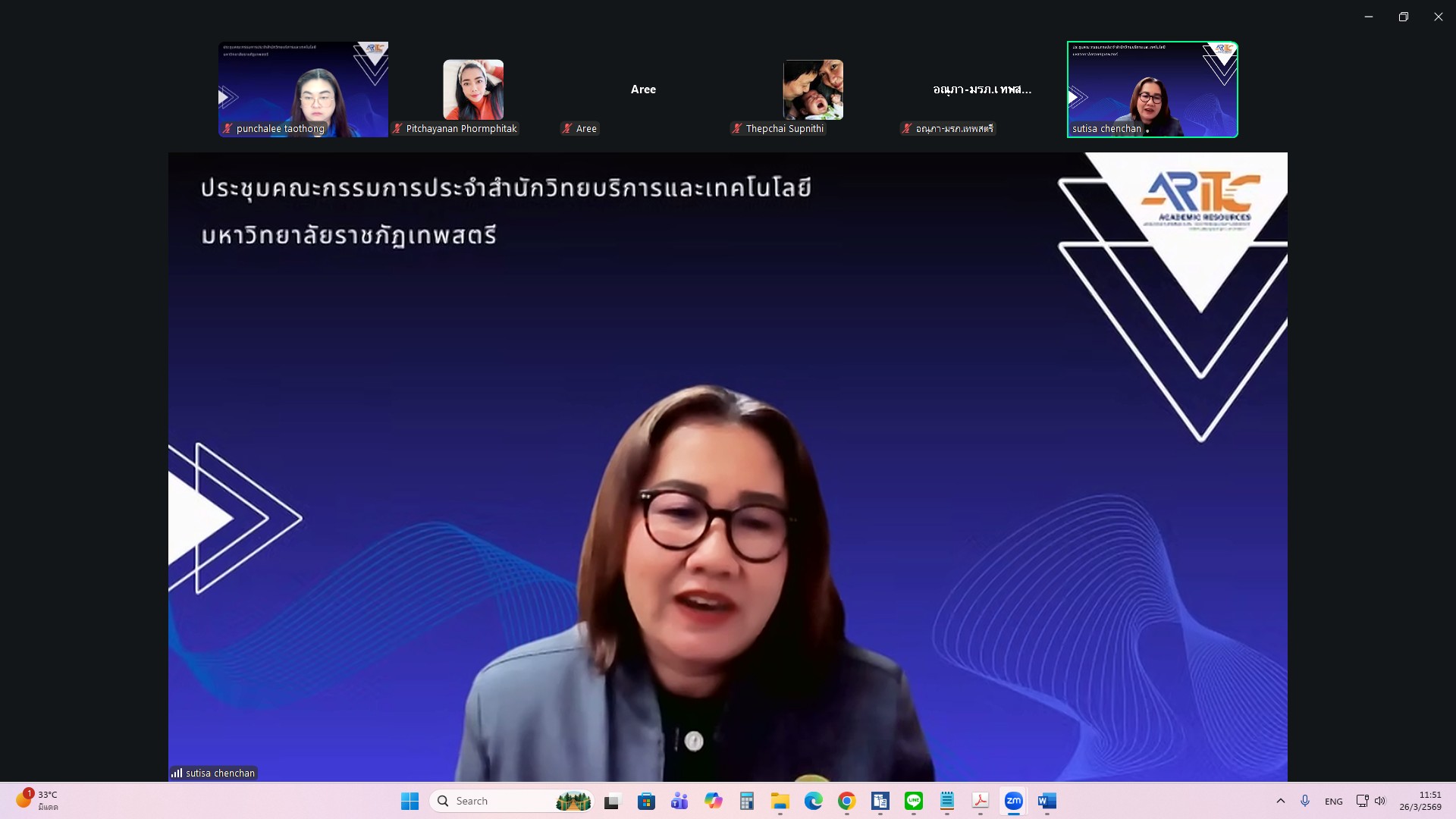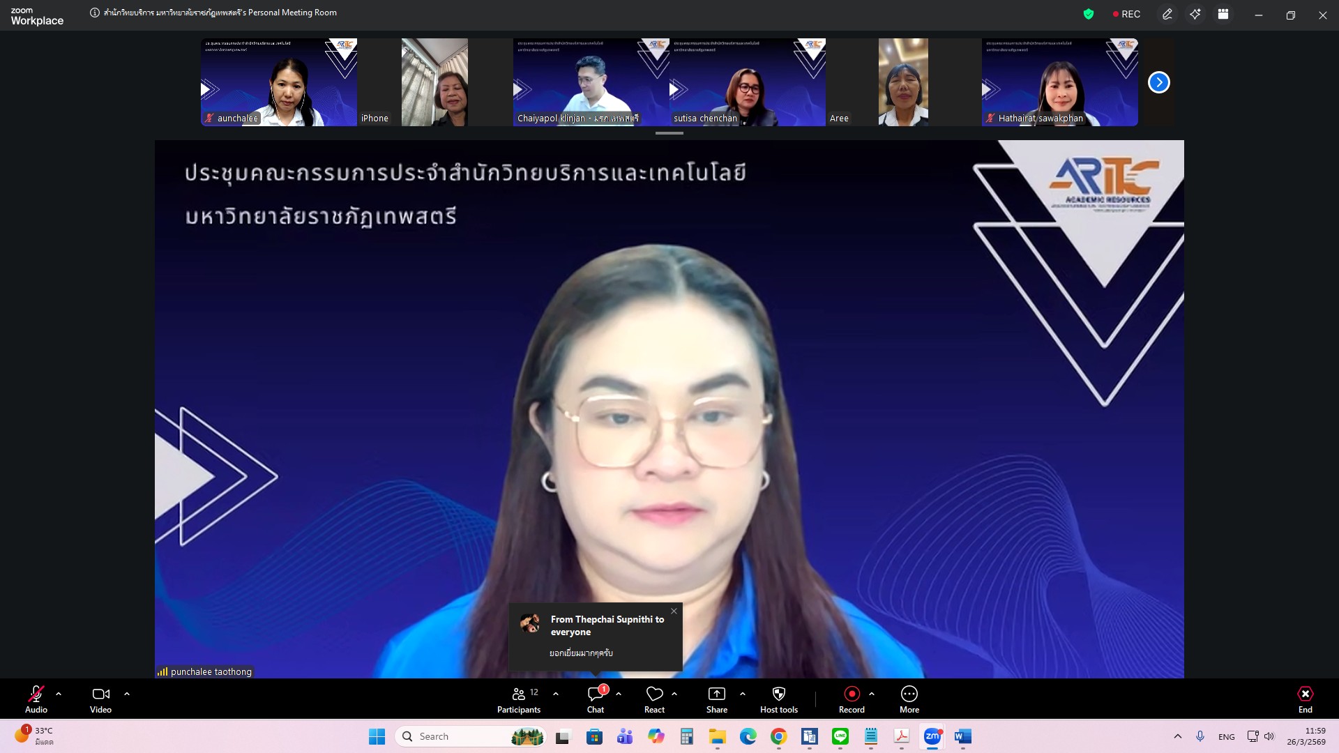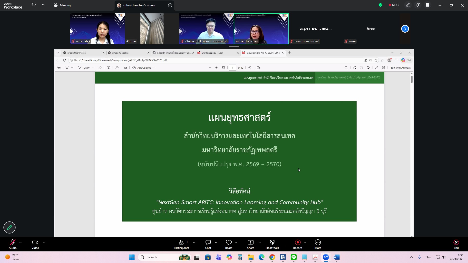 ผศ.ไชยพล กลิ่นจันทร์ ผู้อำนวยการสำนักวิทยบริการและเทคโนโลยีสารสนเทศ มหาวิทยาลัยราชภัฏเทพสตรี ให้เกียรติเป็นประธานการประชุมคณะกรรมการประจำสำนักวิทยบริการและเทคโนโลยีสารสนเทศ ครั้งที่ 1/2569 ในรูปแบบการประชุมระบบ e-meeting ผ่านสื่ออิเล็กทรอนิกส์ zoom Meeting เมื่อวันที่ 26 มีนาคม 2569 เวลา 09.00 น. โดยมีวาระที่เสนอเพื่อทราบ ได้แก่ แผนยุทธศาสตร์สำนักวิทยบริการและเทคโนโลยีสารสนเทศ มหาวิทยาลัยราชภัฏเทพสตรี พ.ศ. 2568–2572 , สรุปผลการ Coaching นำเสนอผลการดำเนินงานสำนักงานสีเขียวและห้องสมุดสีเขียว